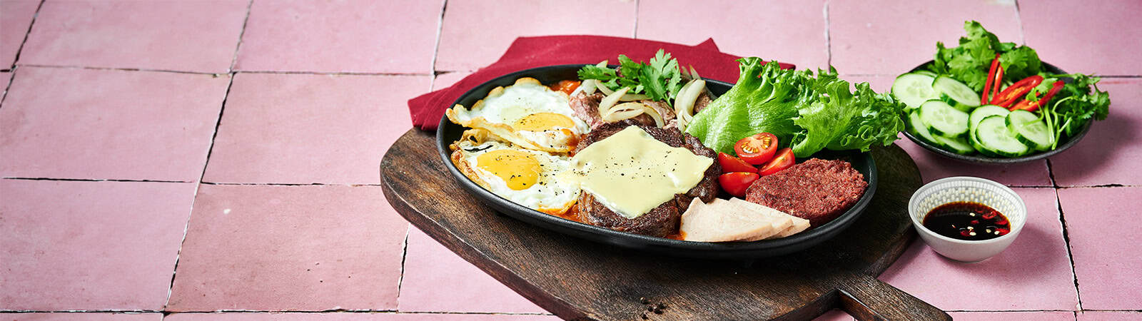Serve the steak and eggs in the pan alongside the bread. Garnish with sliced cucumber and fresh herbs, and serve with dipping sauces such as chilli sauce, ketchup, or lime pepper salt.
